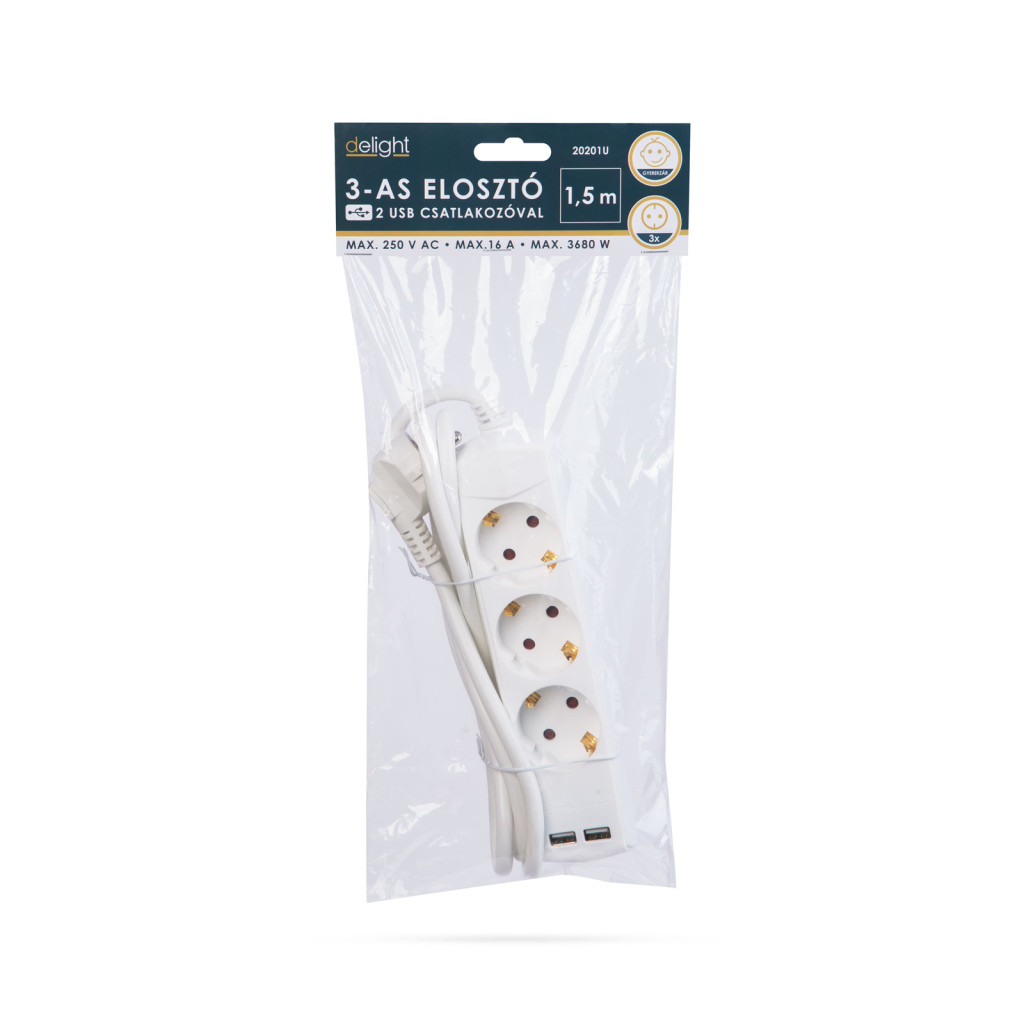 Általános, fehér elosztó, amely használata javasolt háztartásban, irodákban. Az elosztóba épített 2 db USB aljzat segítésével adapterek nélkül töltheti mobilkészülékeit. Jó minőségű, vastag szigetelése megvédi a kábelt a sérülésektől, a kábel esetleges megtörésétől.