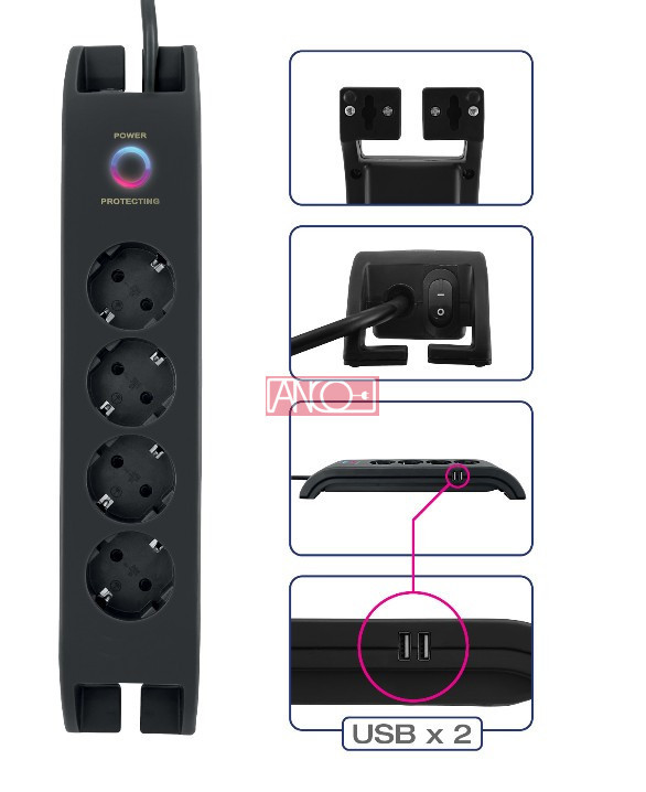 380109- kapcsolóval, gyermekvédelemmel és túlfeszültség elleni védelemmel- 2xUSB-A,- H05VV-F 3G1.5 mm² kábellel- 16 A; 250 V; maximális terhelés:3680 W- kábel hossza: 2m- felületre szerelhető- fekete