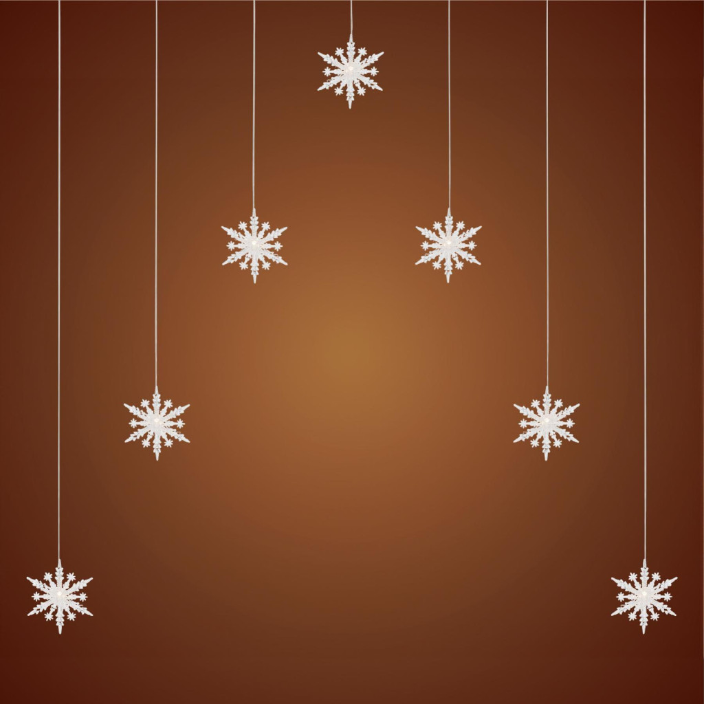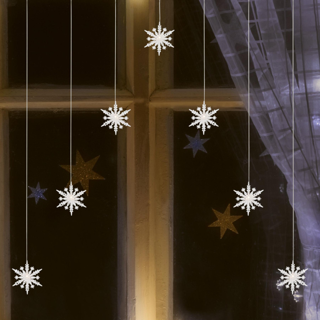 szélesség: 1,2 m • füzérek közti távolság: 20 cm • legmélyebb lelógás a gerinctől (alsó csillag közepe): 1,1 m • legkisebb lelógás a gerinctől (felső csillag közepe): 20 cm • hópehely mérete: Ø15 cm