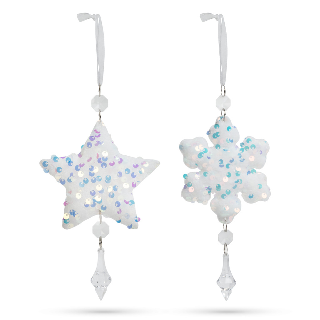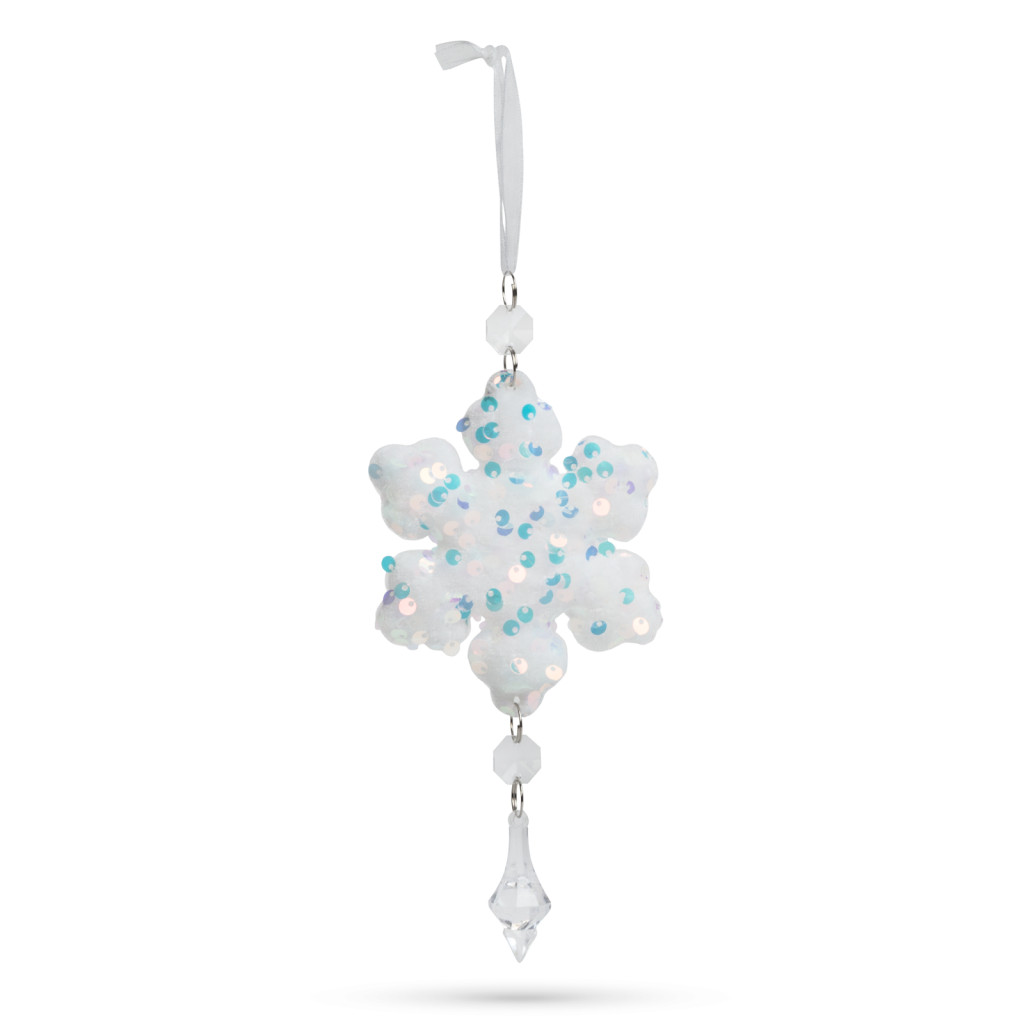 Klasszikus karácsonyi hópehely, csillag dísz, amely bármelyik karácsonyfa ékes dísze lehet. Az glitteres felületen megcsillanó fények meghitt hangulatot teremtenek és ragyogással töltik be a karácsonyfát. A fénytörléseknek köszönhetően lilás, sárgás színekben játszik, attól függően, hogyan esik rá a fény.
