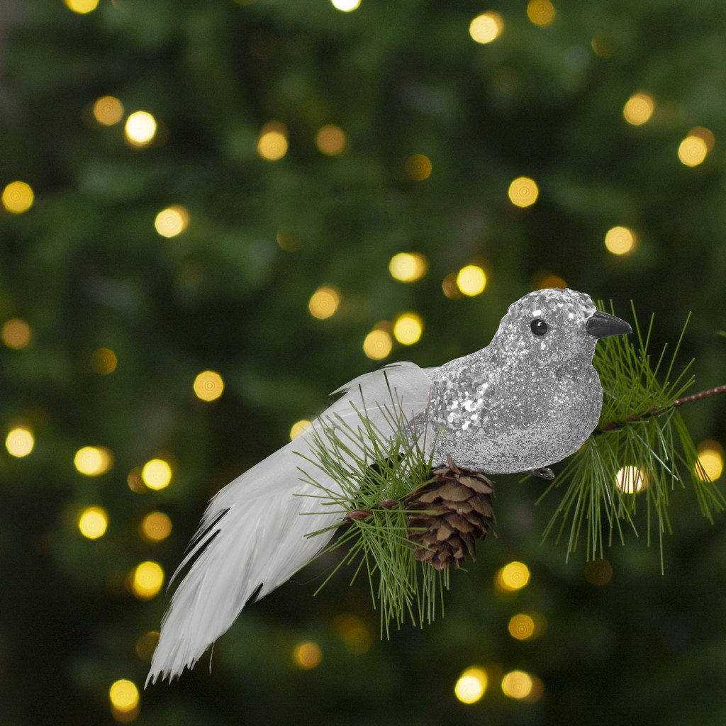 Különleges karácsonyi dekorációs termék, amely csipesz segítségével rögzíthető. A madár csillámos, glitteres felülettel rendelkezik, tollait csillogó szalag díszíti.