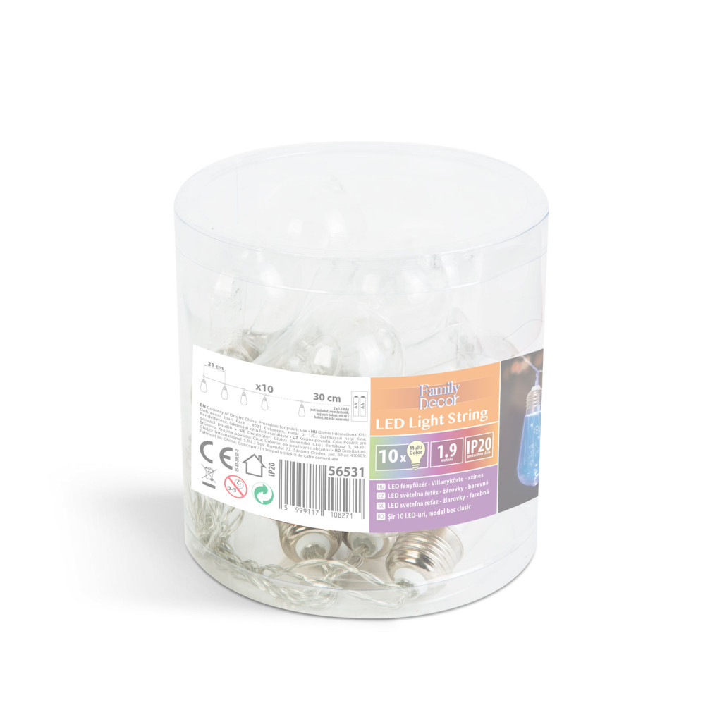 Izzókörte formájú, hangulatos LED fényfüzér. Az izzók közepén karácsonyi, téli mintával, melyet színes LED világít meg felülről, így otthonában minden irányból csodálatos vizuális élményt nyújt. Ideális lehet karácsonyfák, girlandok, polcok, koszorúk, függönyök díszítésére. A LED fényforrás alacsony energiafelhasználása miatt, elemmel is sokáig üzemeltethető.