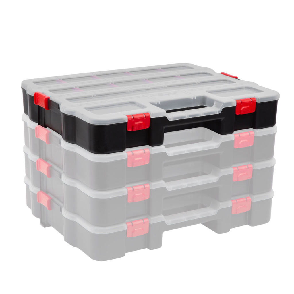 Innovatív rendszerező táskák, amelyek tetszőleges sorrendben egymáshoz kapcsolhatóak, így egyidejűleg könnyedén hordozhatóak. Az oldalán található retesz segítségével oldhatóak a ládák, így gyorsan hozzáférhető az éppen szükséges segédanyag. Az átlátszó fedélnek köszönhetően áttekinthető a beltartalom, akár kinyitás nélkül megtalálhatja a szükséges táskát. Rendszerezze a különböző méretű és típusú csavarokat, tipliket, alátéteket, anyákat, szerelési segédanyagokat külön-külön táskába a gyors és hatékony munkavégzés érdekében! A ládák strapabíró, erős műanyagból készültek, így hosszú élettartammal rendelkeznek. Praktikus, hiszen akár 18 db tárolórekesz is kialakítható, a mozgatható elválasztók segítségével. Ha nem használja az opcionális elválasztókat 2 db nagyméretű tárolórekeszt is rendelkezésre állhat, ahova akár csavarhúzót, villáskulcsot vagy egyéb szerszámot is tehet.