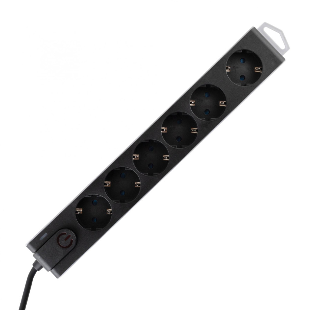 Home NVT 6K-3/BK túlfeszültségvédett hálózati elosztó, 3 m, H05VV-F 3G1,5 mm2 kábel, 6 aljzat gyermekvédelemmel, kapcsoló, felakasztható, max. 3680W, fekete